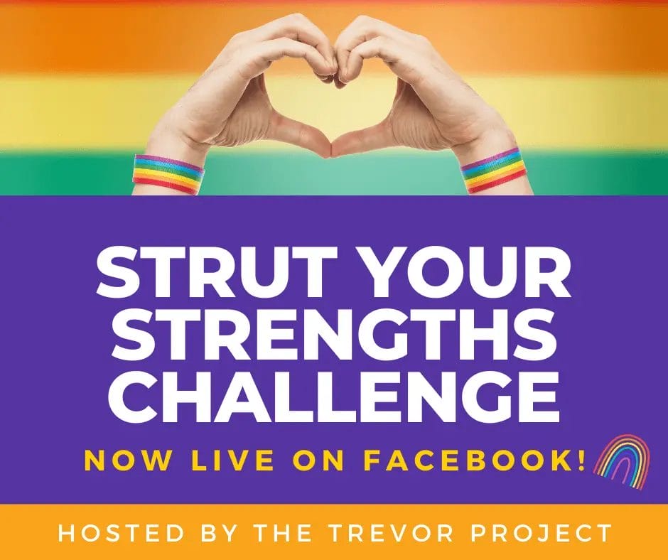 Join the Trevor Project in celebrating its 25th anniversary in their 25 Strut Your Strengths Facebook Challenge! This virtual fundraiser is all about doing activities you enjoy while raising money to support LGBTQ young people.